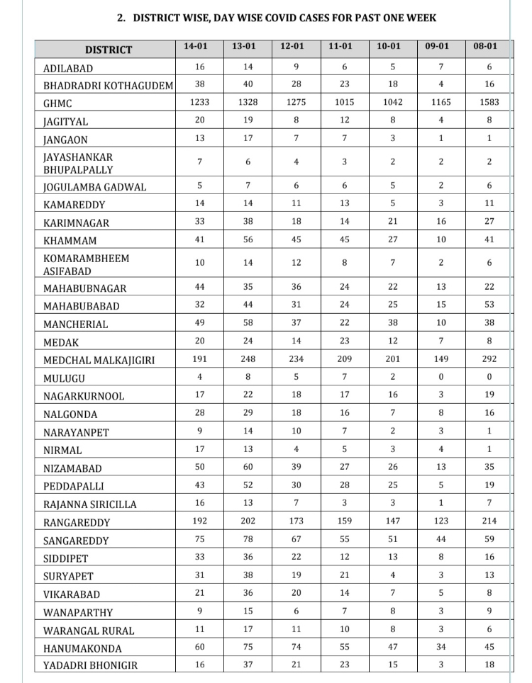 హైదరాబాద్ (తెలంగాణ వార్త) తెలంగాణ రాష్ట్రంలో నీ వివిధ జిల్లాల్లో లో ఈరోజు వరకు కరోనా కేసుల వివరాలను తెలంగాణ ప్రభుత్వం విడుదల చేసింది ఏ జిల్లాలో ఎన్ని కేసులు నమోదైనది ట్విట్టర్ ద్వారా మీడియాకు బులియన్ విడుదల చేసింది అది ఈ విధంగా ఉంది