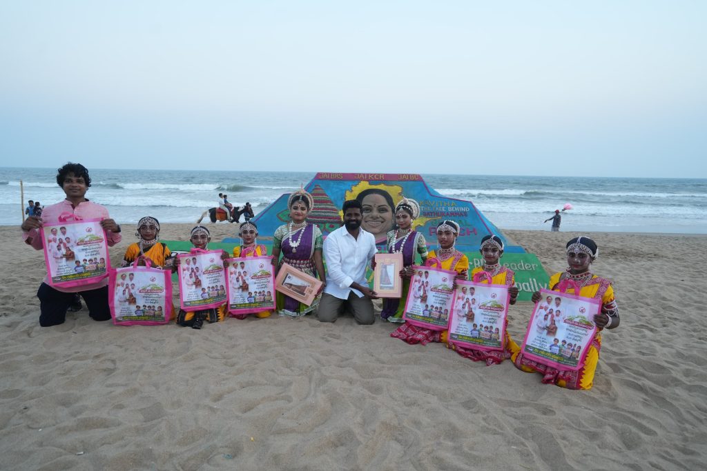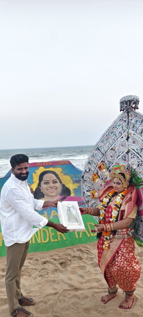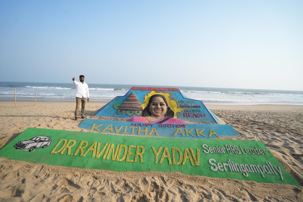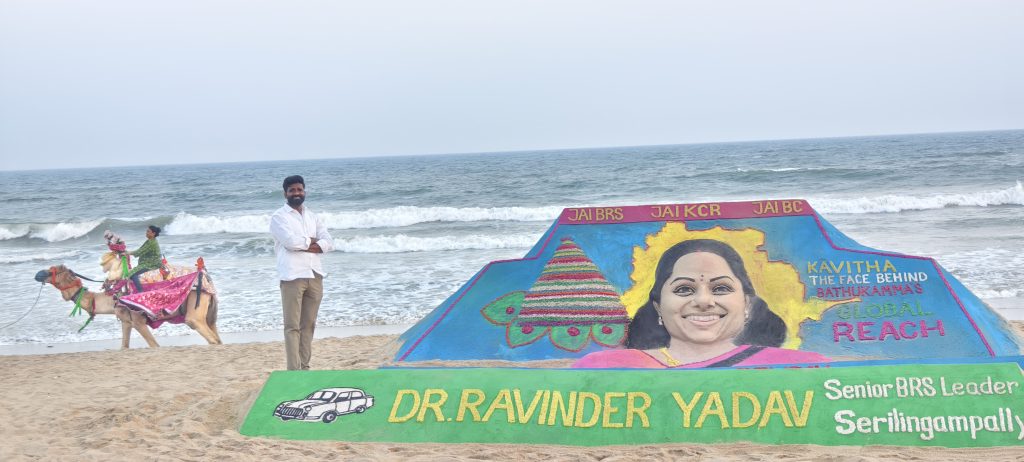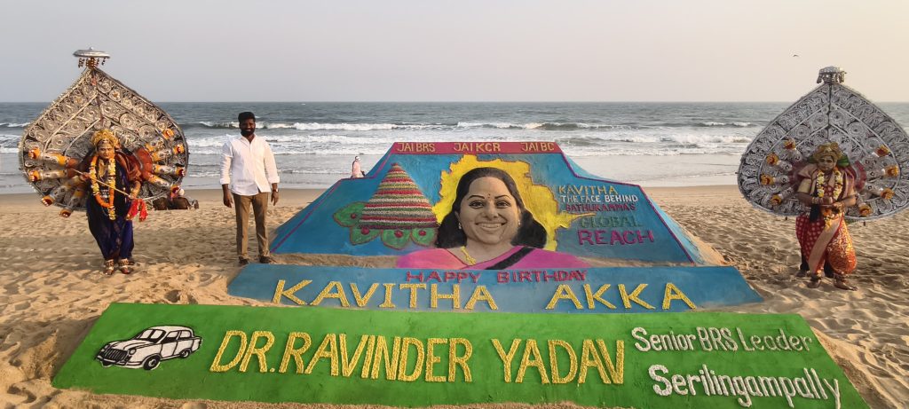 *ఎమ్మెల్సీ కవిత సైకత శిల్పంను ఏర్పాటు చేసిన రవీందర్ యాదవ్*